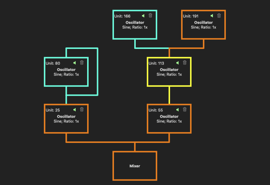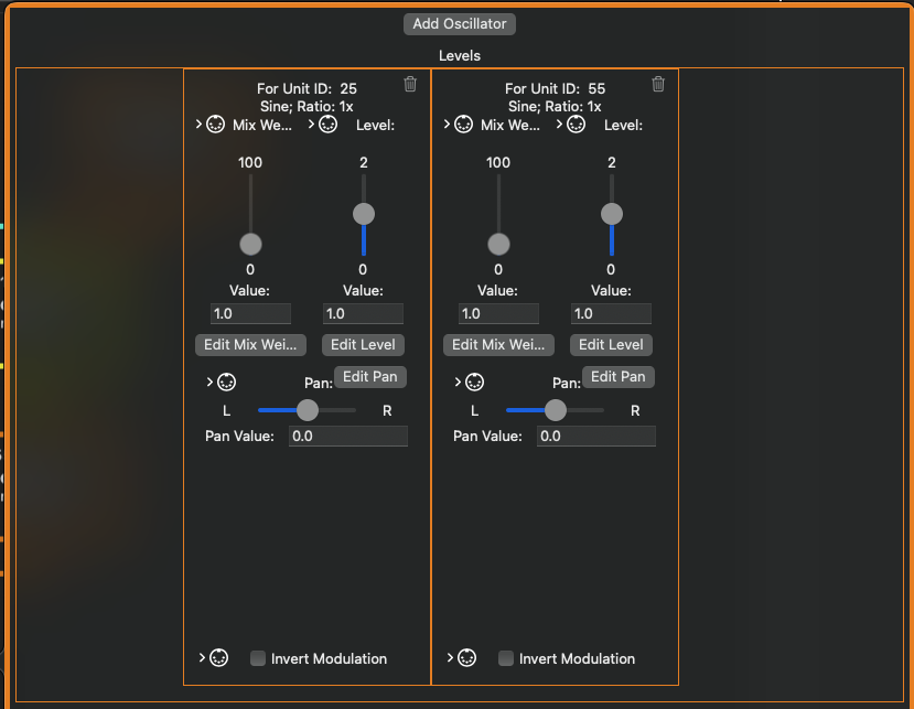 - Add or remove oscillators wired directly to the Mixer, and adjust their pan position and levels in the overall sound’s mix. These Oscillators are the roots of their own modulation trees, and removing them will remove all downstream, non-shared, non-system modulators.