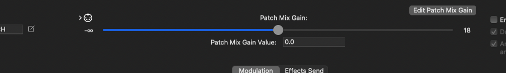 Each Patch has its own overall Gain parameter, in decibels. When sounds generated by a Patch are playing alongside sounds from other Patches, it may be helpful to punch up these sounds in the mix, or keep them low and in the background. Gain has a range of negative infinity (complete silence) to +18 db.