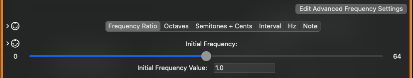 Start with a new Patch, with only a single Oscillator, and open the Mixer panel. If you haven’t changed the tuning system, play Middle C (or any other key in any other tuning system, just trying to keep things simple) – play Middle C, you hear Middle C. Now play and hold Middle C, then drag the Mixer’s Initial Frequency slider – the pitch changes. Add a second Oscillator to the Mixer, and set its Initial Frequency parameter to a ratio of 1.5. Play Middle C again, and drag the slider around – both pitches change, but stay the same distance apart, relative to each other. By dragging the slider, you are changing the ROOT FREQUENCY of the sound. Why “root frequency” and not just “frequency”? Reset the Mixer’s slider to 1.0, then go to the original Oscillator, and change its Initial Frequency parameter to a frequency ratio of 2.0. Now play Middle C – it is not present! The Oscillators (and other components which use frequency as a parameter) are typically set to be relative to the intended note. If you wanted to transpose every sound generated by this patch, or you manipulated the Pitch Bend wheel on a MIDI controller, the sample-generating components still need to operate in the correct ratios to keep the timbre consistent.