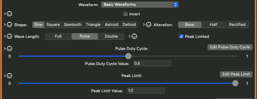 - All of the basic wave shapes and their alterations can be converted to pulse waves, meaning a full wave followed by silence, within the overall wavelength dictated by frequency, or “doubled”, such that a full wave is followed by another full wave within the overall wavelength determined by frequency. These alterations have their own modulatable Duty Cycle parameter, so that for the pulse, the ratio of wave to silence can be varied, and for the “double”, the ratio of the first and second waves can vary — you can have a short first wave followed by a longer second wave. Many early digital synths offered such pulse and “doubled” waves.