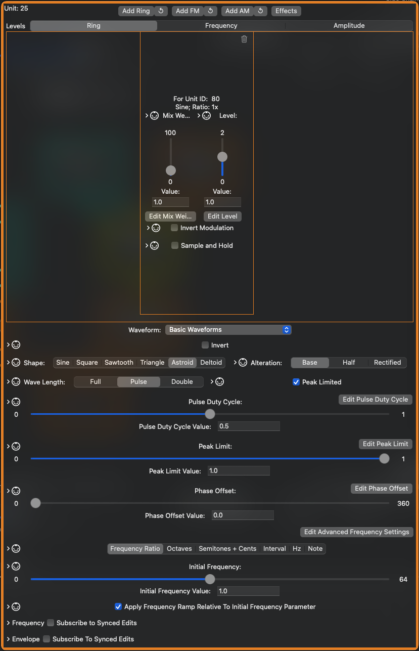 From the main window’s algorithm view on the Modulation tab, you can change and manipulate an Oscillator’s settings by clicking on its box. Oscillators, and many other components, are internally assigned a Unit ID, which is displayed to assist in identifying/keeping track of the various components of your Patch. Every Oscillator has its own Initial Frequency – this value is relative to the root frequency of the sound (unless you use a fixed frequency in units of Hz), and otherwise can be manipulated/assigned in identical fashion.