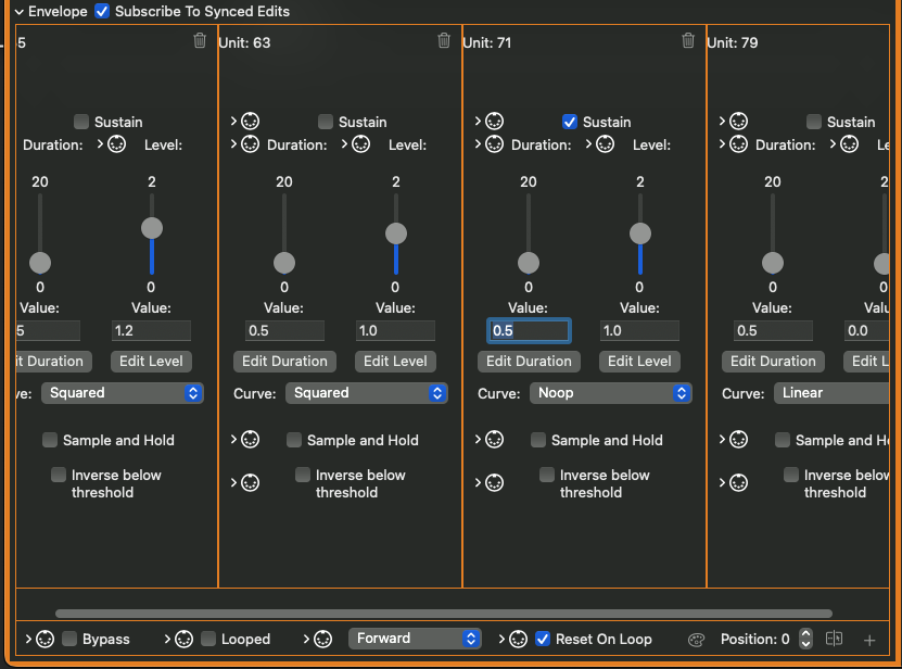 The envelope stage panel has two sliders – duration, in seconds, and level, in the units of the parameter. For amplitude envelopes, level is amplitude and ranges from 0.0-2.0 – this is intended to give some headroom for, say, extra attack. Think of a clanging bell – you probably think of the sustained ring of the bell as its full amplitude, equating to an amplitude of 1.0; however, the initial attack as the bell is stuck is louder than the sustained ring. For Frequency Ramps, the level slider is expressed in the chosen unit of frequency – Ratio, Octaves, Named Interval, Semitones/Cents, or Hz. Each envelope stage in a Frequency Ramp can be expressed in different units – you may want the initial stage to be a ratio of the sound’s root frequency, but converge on a single fixed frequency in the next stage, regardless of note played.