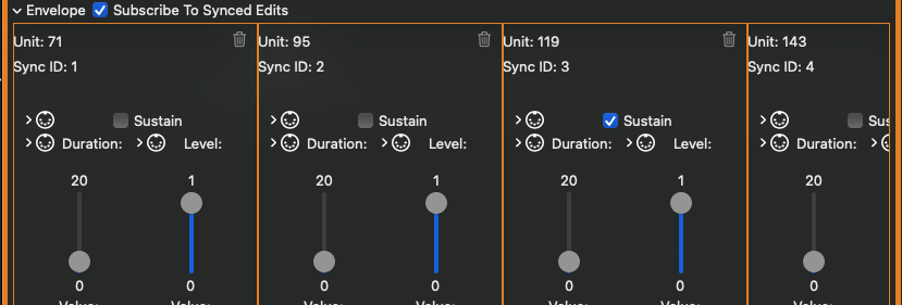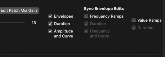 To automatically sync envelope edits, select the types of envelopes you would like to sync from the Sync Envelope Edits checkboxes in Patch settings (system-level envelopes have their own set of settings, in the system-level panel). A new patch does not sync any edits. You can opt-in amplitude envelopes, frequency ramps, and/or value ramps at any point during patch editing — all edits from the point of opt-in are synced. Envelopes can individually subscribe or unsubscribe to synced edits — each envelope has a Subscribe to Synced Edits checkbox at the top of the envelope view.