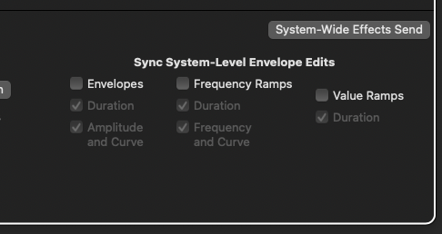 When envelope edit syncs are enabled, edits to any subscribed envelope are applied to all subscribed envelopes for the patch (excluding hidden envelopes attached to effect parameters, such as the oscillator modulating a flanger effect). All envelope-wide parameters, as well as addition/removal of envelope stages, and setting/unsetting of the Sustain stage, are synced when the envelope category is selected. If multiple categories are selected, say both amplitude envelopes and frequency ramps, such edits are synced across all subscribed envelopes of the selected envelope types. Additionally, an envelope stage’s duration, amplitude/frequency, and curve type can be opted in or out. Changes to an envelope stage are synced across all subscribed envelopes’ corresponding stage. If you modify the curve of the attack stage, synced edits apply the change to the attack stage of every subscribed envelope. Parameter modulation trees, Key and Velocity Tracking, and parameter randomization settings are never synced, as these settings tend to be very tailored to specific parameters. Similarly, Modulated Value values cannot be synced, as each parameter is expressed in its own units, which typically do not translate well to other parameters.
