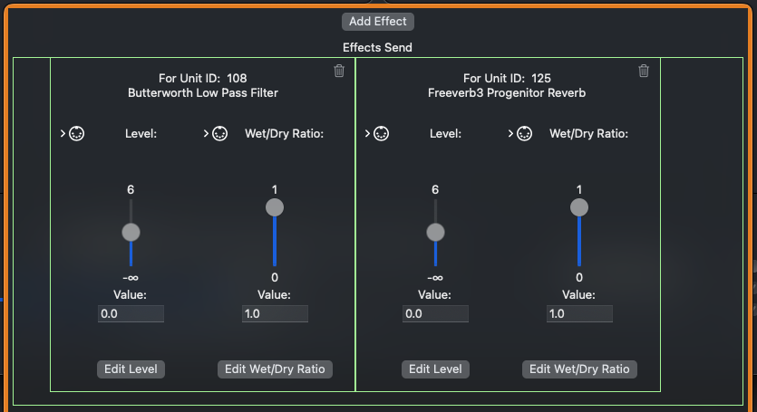 Each object which supports an effects chain, including effects themselves, contains an array of settings panels for each effect wired to it. The settings contain the following sliders to control how the effect is applied: